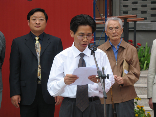 揭牌典礼在礼乐队欢快的乐曲声中开始。浙江师范大学校长兼儿童文化研究院院长梅新林教授首先致辞,他说,回顾我校儿童文学学科发展的光辉历史,儿童文学学科头戴无数个“国内第一”的桂冠一路走来;而今天儿童文化研究院的成立,又是一个新的“国内第一”。国内高校首家儿童文化研究院的成立,正在书写着儿童文化研究的历史并且还会继续书写下更多的辉煌。著名作家、翻译家任溶溶先生代表来宾发言,这位一辈子在儿童文学园地兢兢业业、辛勤耕耘的老先生对儿童文化研究院的发展寄予厚望。接着,宋永刚副司长、蒋风教授为研究院揭牌。浙师大聘请原浙师大校长蒋风教授为儿童文化研究院名誉院长,聘请任溶溶、梅子涵、吴其南、孙建江为研究院首批兼职教授,梅新林校长向他们颁发了聘书。揭牌典礼在金华市青少年宫孩子们的诗朗诵《北山下的约定》中落下帷幕。