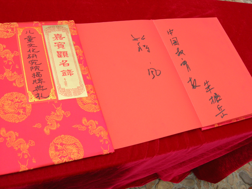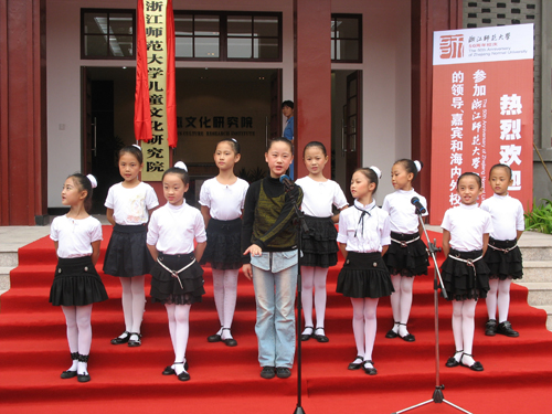 儿童文化研究院揭牌典礼于2006年10月2日下午3:00于红楼南广场进行,由校党委副书记黄华童教授主持,教育部师范教育司副司长宋永刚,浙江师范大学校长梅新林,著名儿童文学作家、学者蒋风、任溶溶、圣野、梅子涵、吴其南、孙建江,台湾著名儿童文学作家管家琪,法国巴亚国际出版社亚太地区总经理任荣康,儿童文化研究院方卫平、刘宣文、彭懿、赵霞、张英萍,本校各相关职能部门和学院的领导,儿童文学、儿童教育和儿童心理的研究生和本科生等参加了揭牌典礼。
