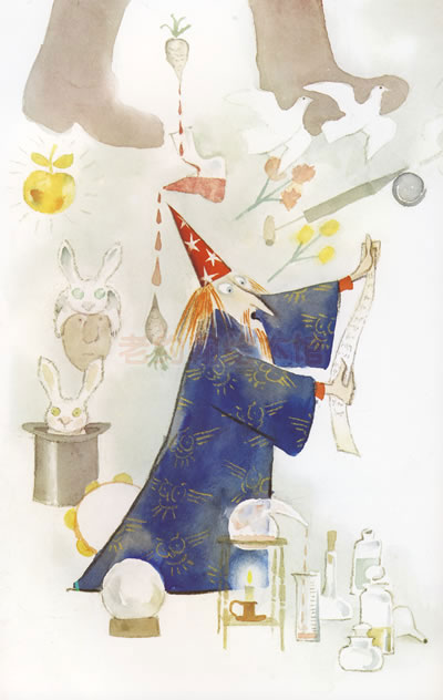 环村上是一幅远景图:一轮硕大的圆月悬在夜空,海边的一座城堡在月光下朦朦胧胧。这一切给人以平静安详之感,而故事正是在这座城堡里展开。蒂蒂公主病了,对国王说想要月亮。疼爱女儿的国王便找来三个“聪明”的大臣,让他们把月亮弄到手。可他们都坚决说办不到。但最后倒让一个宫廷小丑办成了。月亮怎么能捕捉到手,寄养在身边呢?在科学家探索月球以前,我们根本不知道它的大小与精确距离,但是几乎每个人心里对月亮都是有过无限遐想和自己的臆测的。你看,总理大臣说,月亮“远在三万五千里外”、“比公主房间大得多”、“由熔化的铜做成”;宫廷魔法师说,月亮“远在十五万里外”、“是皇宫的两倍大”、“用绿起司做成”;宫廷数学家说,月亮“远在三十万里外”、“有半个王国大”、“由石棉做成”;而就连宫廷金匠也说月亮“远在五十里外”、“用青铜做成”、“像大理石一样圆”。就像一千个读者心里就有一千个哈姆莱特,月亮在人们各自心里的形象也是不一样的。这些“聪明”的大人们似乎都自以为准确丈量了其大小、距离和材质,所以认定月亮之不可得时的态度是那样坚决。但细思起来,他们表述时使用还是感性、形象的比较法和譬喻法,是以自己的有限的认知为标准的,所以,这样感性的标准是人人皆有且人人不同的。也许宫廷小丑时常为孩子逗乐,明白儿童思维与成人思维的差异,所以才决定“对症下药”,亲自问问公主眼中的月亮。公主的答案是“大概比拇指的指甲小一点”、“不比窗外的大树高”、“是用金子做的”。看到这里,笔者终才恍然大悟,原来护封上公主举着拇指对着月亮的目的是在估算月亮的大小呢!后来,公主得到了一条金月亮项链,病也痊愈了。